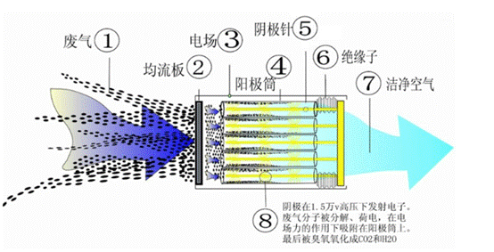 至5000萬次的速度反復(fù)轟擊廢氣的分子,去激活、電離、裂解廢氣中的各種成份,從而發(fā)生氧化等一系列復(fù)雜的物理化學(xué)反應(yīng),在平均能量約5eV的大量電子作用下,使通過凈化器的廢氣分子轉(zhuǎn)化成各種活性粒子,與空氣中的O2結(jié)合生成H2O、CO2等低分子無害物質(zhì),采用高壓發(fā)生器形成低溫等離子體,使廢氣得到凈化。