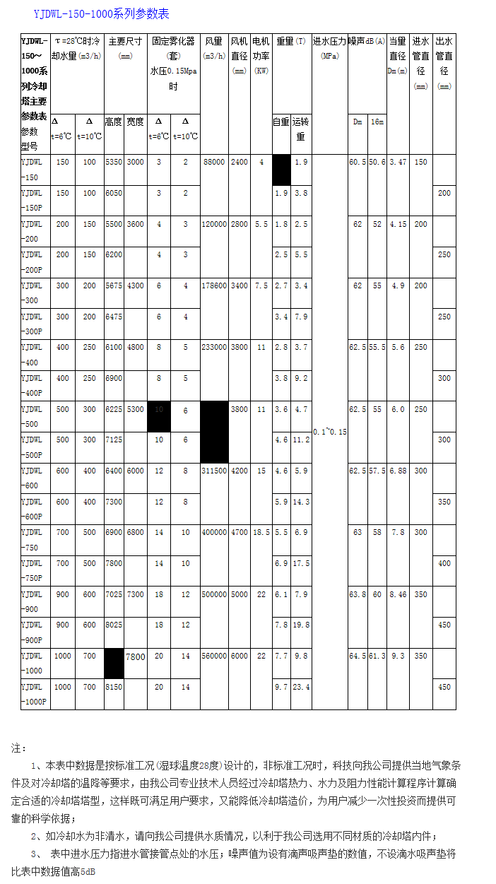 標記示例:YJDWL-500表示機力通風普通型無填料噴霧冷卻塔,鋼結構框架、方形、無水盤、流量500m3/h。