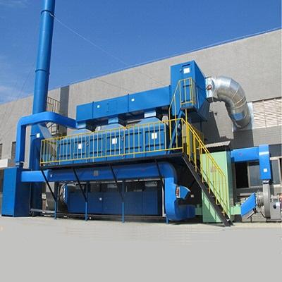 利用催化劑降低燃燒溫度,由于催化劑的載體具有較大的比表面積和合適的孔徑,當(dāng)加熱到260~450℃的有機(jī)氣體通過(guò)催化層時(shí),氧和有機(jī)氣體被吸附在多孔材料表層的催化劑上,增加了氧和有機(jī)氣體接觸碰撞的機(jī)會(huì),提高了活性,使有機(jī)氣體與氧產(chǎn)生劇烈的化學(xué)反應(yīng)而生成CO2和H2O,同時(shí)產(chǎn)生熱量,從而使得有機(jī)氣體變成無(wú)毒無(wú)害氣體。催化劑主要有鉑、鈀和釕等。催化燃燒裝置主要由熱交換器、燃燒室、催化反應(yīng)器、熱回收系統(tǒng)和排放煙囪等部分組成。